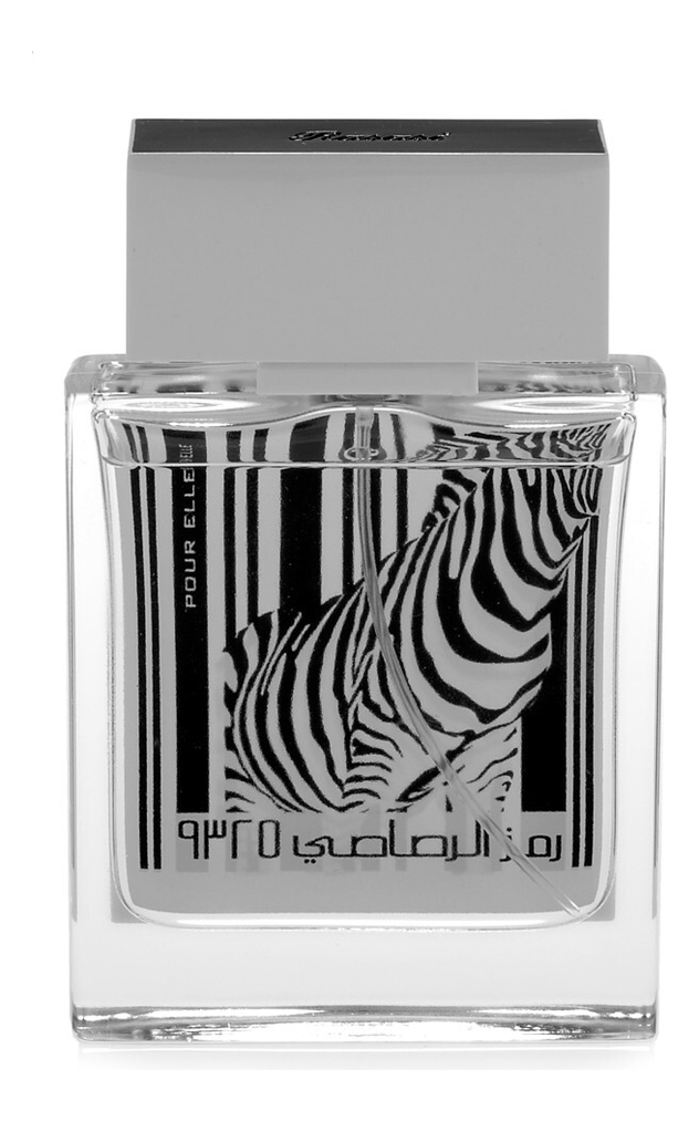 Rumz Al Rasasi 9325 Pour Elle — освежающий, природный по звучанию и просто очень красивый женский восточный аромат, выпущенный в 2014 году известным арабским парфюмерным брендом Rasasi. Черно-белый принт с изображением зебры на лаконичном прозрачн...